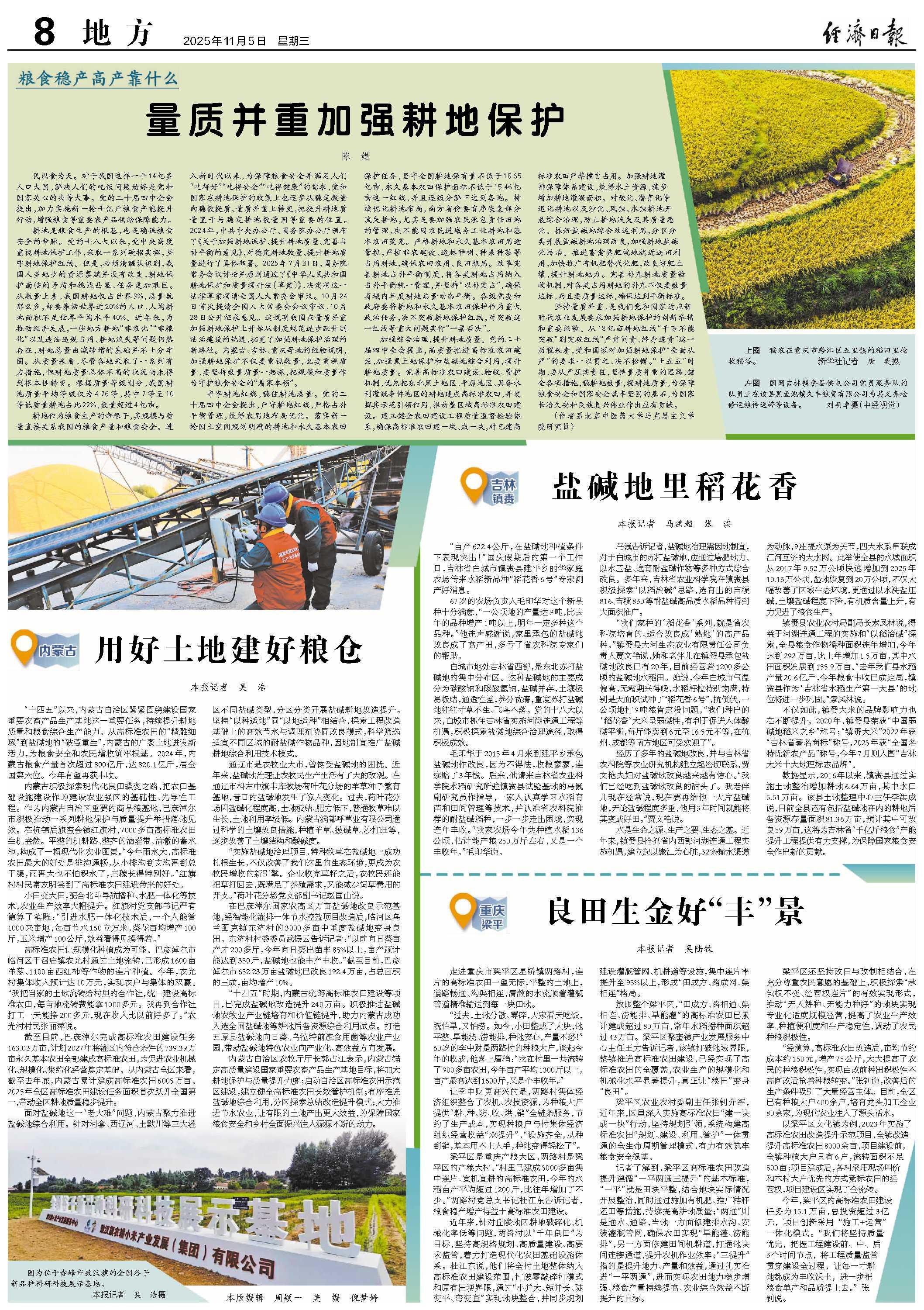 今年,梁平区的高标准农田建设任务为15.1万亩,总投资超过3亿元,项目创新采用“施工+运营”一体化模式。“我们将坚持质量优先,把握工程建设前、中、后3个时间节点,将工程质量监管贯穿建设全过程,让每一寸耕地都成为丰收沃土,进一步把粮食单产和品质提上去。”张钊说。