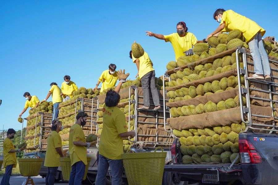 2021年5月30日,在重庆洪九果品股份有限公司位于泰国尖竹汶府的工厂内,工作人员在装运即将销往中国的榴莲。新华社发