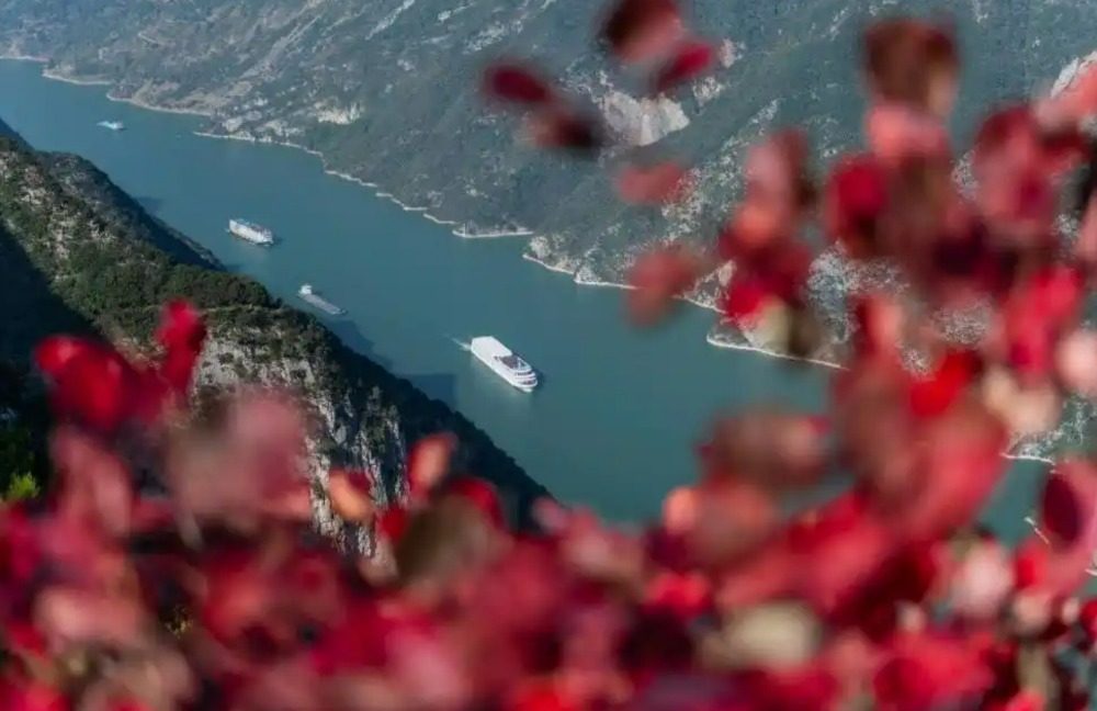 从巫山县黄岩景区眺望长江,在红叶映衬下,一艘艘船只航行在三峡,构成一幅美丽画卷。记者 谢智强 摄/视觉重庆
