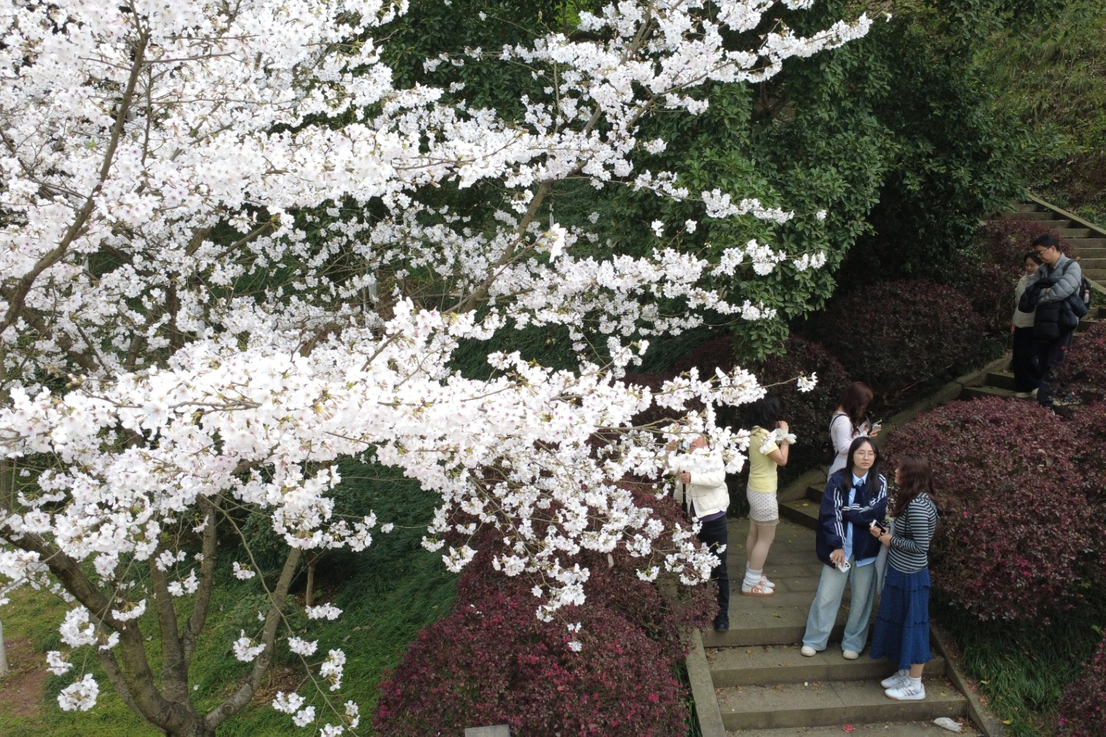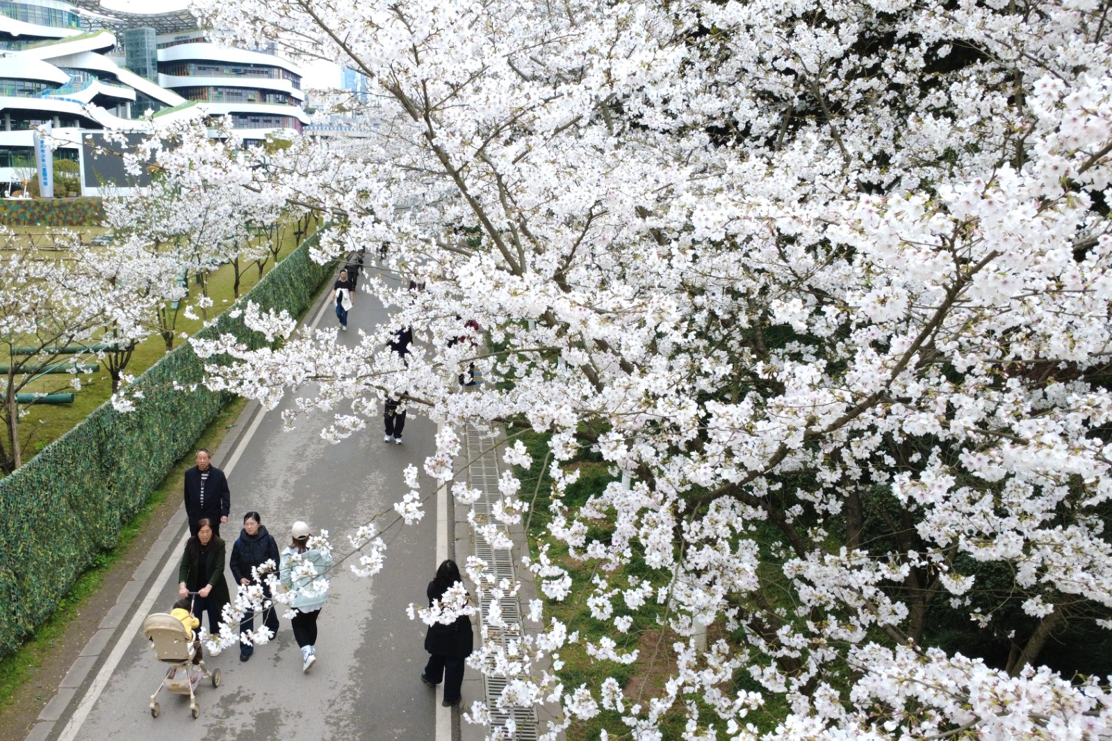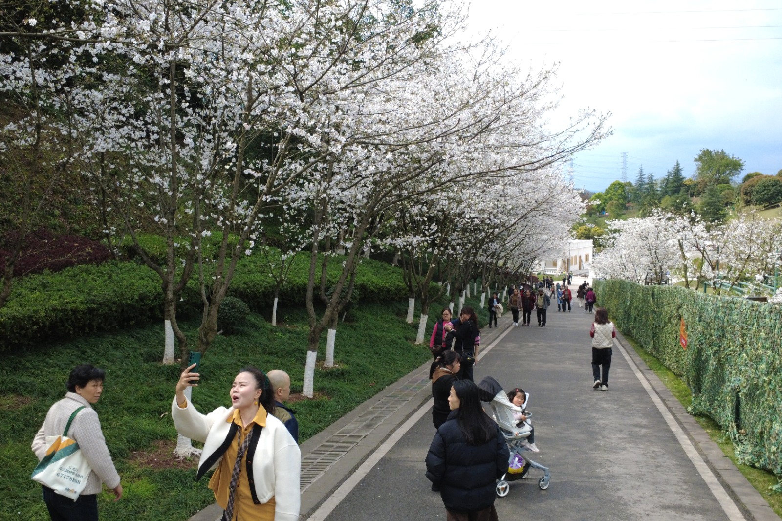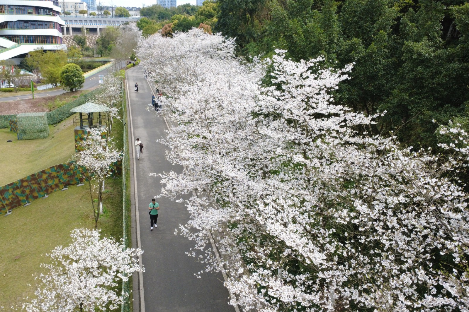 在位于东门右侧斜坡至港澳园沿线的大道两旁,园内千余株“染井吉野”樱花进入盛放的季节。朵朵樱花如云似雪;远远望去,繁花满树、如雾似雪。置身樱花大道,春风吹过,感受樱花如雨般飘落,让人舒适惬意。市民谢女士说,最近天气很好,专门过来赏樱花。觉得很漂亮,微风吹过,就像下花瓣雨一样。市民付女士说,看到樱花感觉很浪漫、很温馨,整条路雪白一片,超级出片。