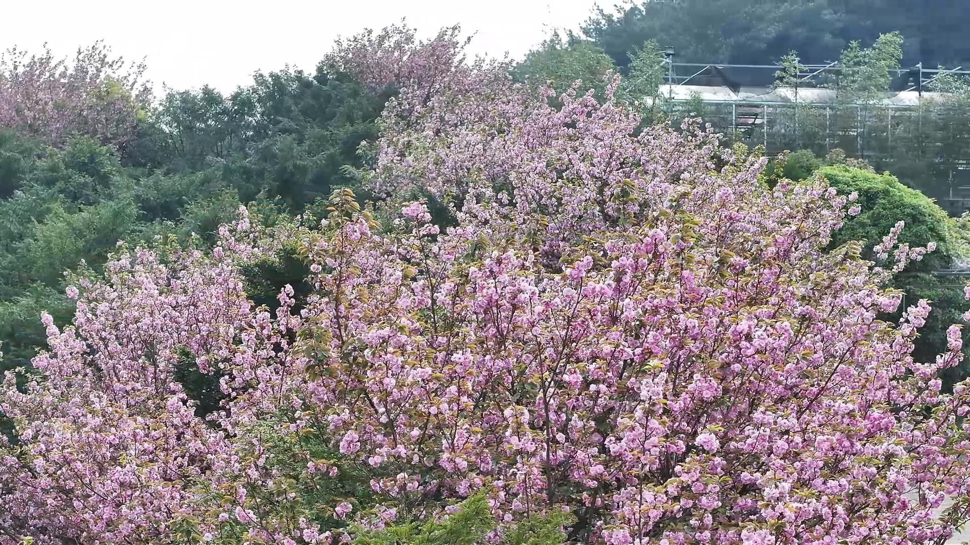 漫步林间,晚樱迎风舒展,粉白淡红的花色在青山绿树映衬下格外娇艳。花瓣随风轻舞,花香沁人,漫步其中,宛如一幅生动的春日山居图。