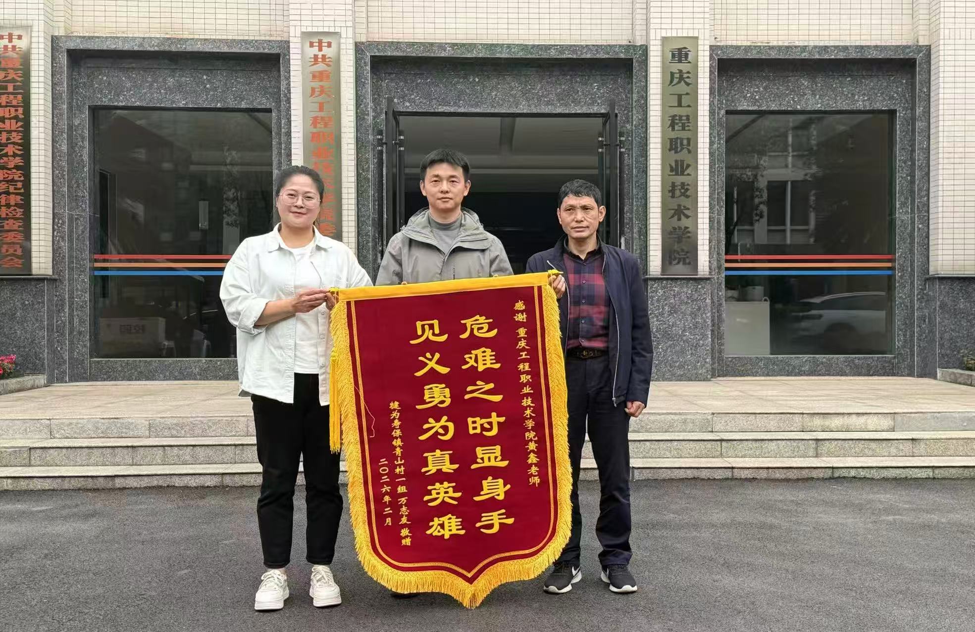 3月5日,四川乐山犍为县一位17岁学生的家长专程赶到重庆工程职业技术学院,向该校安全技术与管理专业辅导员黄鑫送上锦旗,感谢他在旅游途中挽救了孩子生命。