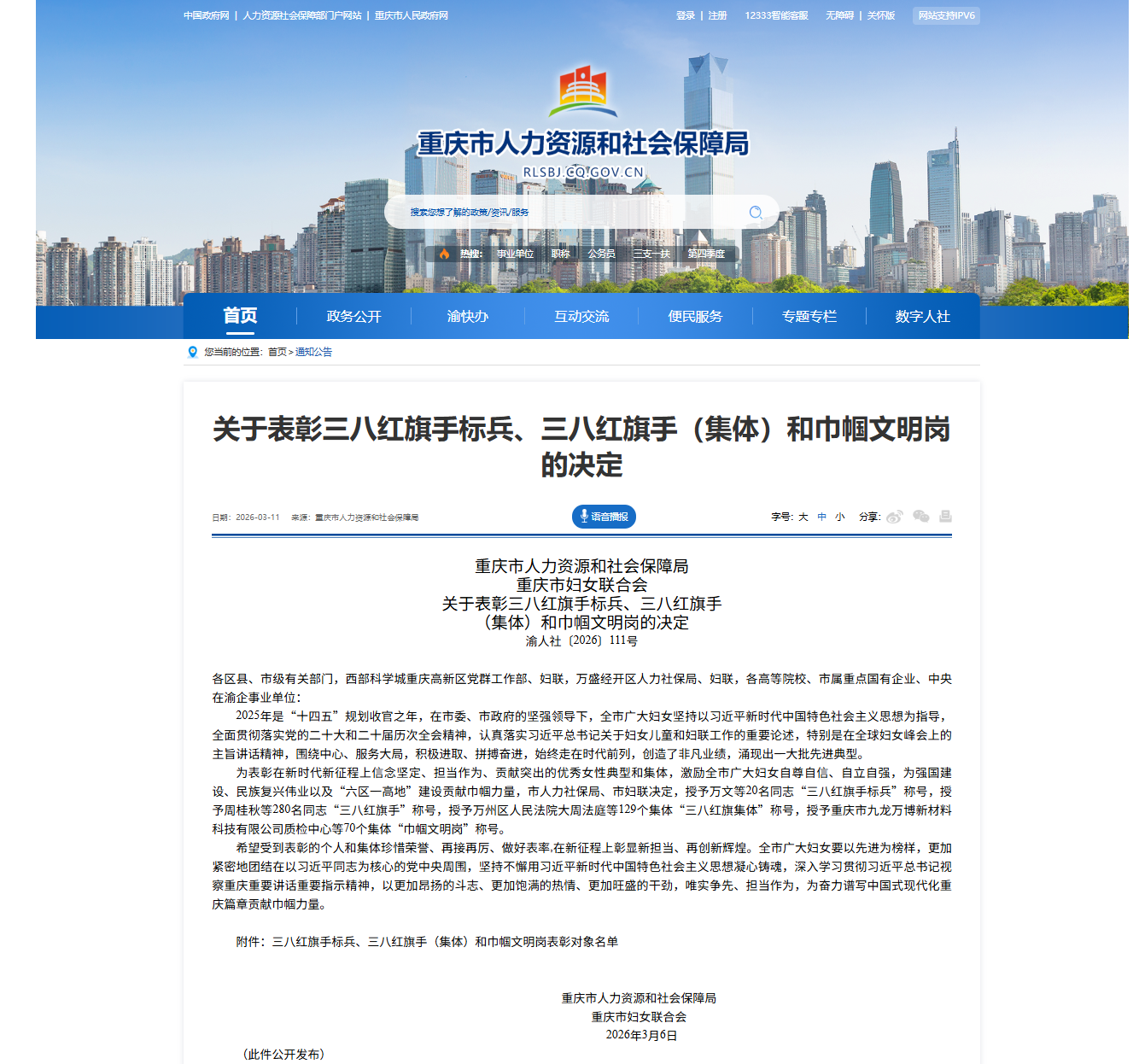 近日,重庆市人力资源和社会保障局、重庆市妇女联合会印发《关于表彰三八红旗手标兵、三八红旗手(集体)和巾帼文明岗的决定》(以下简称决定)。