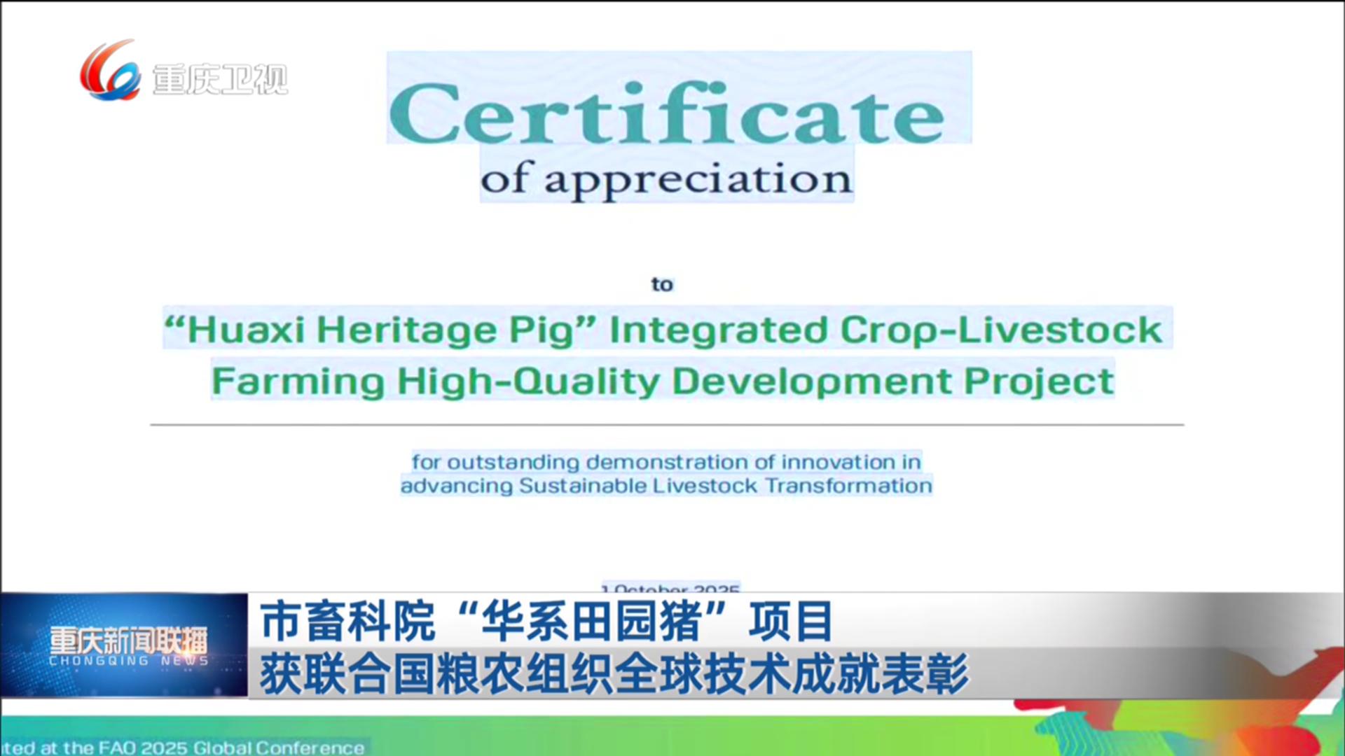 市畜科院“华系田园猪”项目获联合国粮农组织全球技术成就表彰
