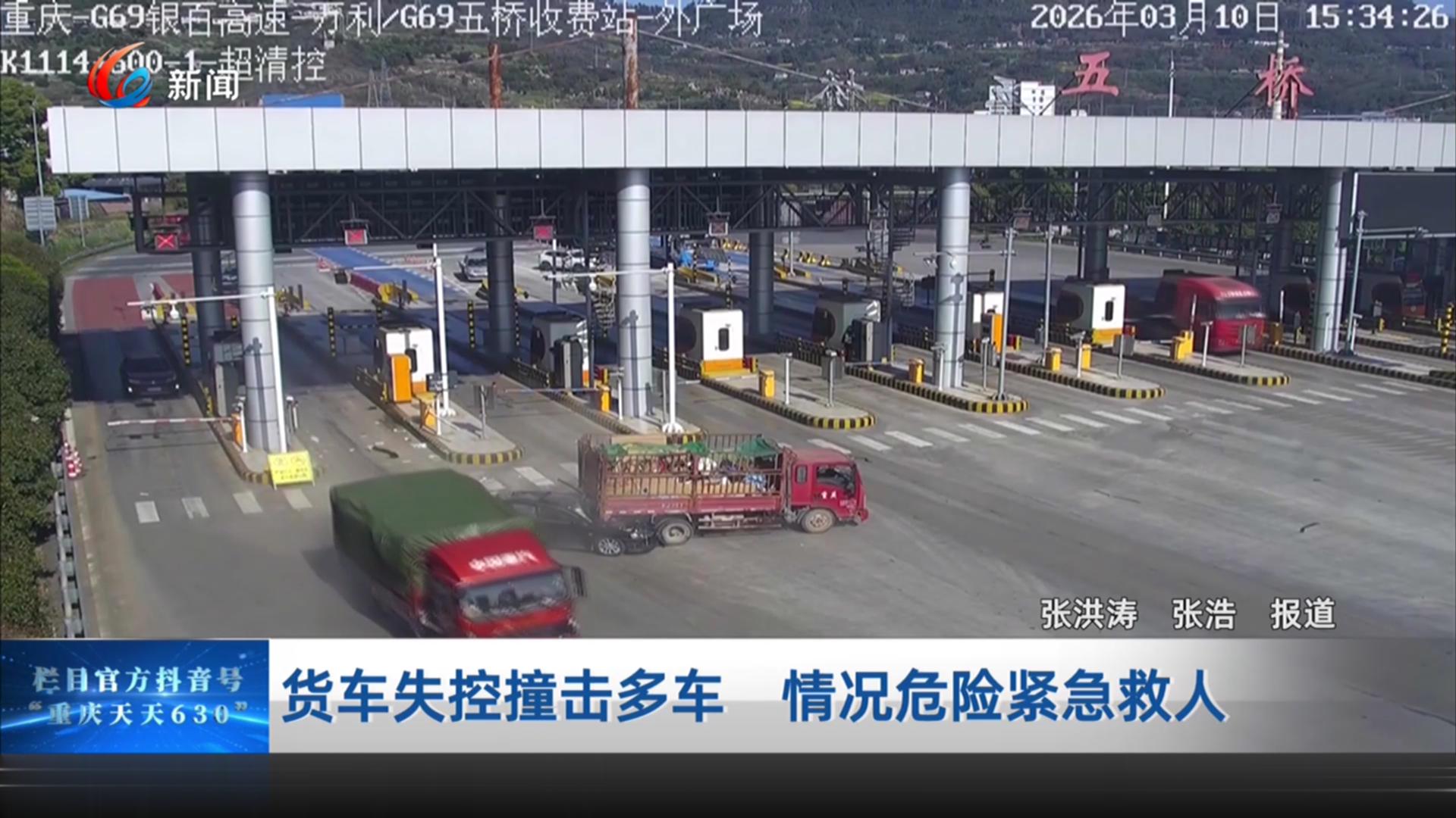 一辆货车因为刹车失灵,在收费站连续撞击前方多车引发险情,现场执法人员迅速组织抢险救人。