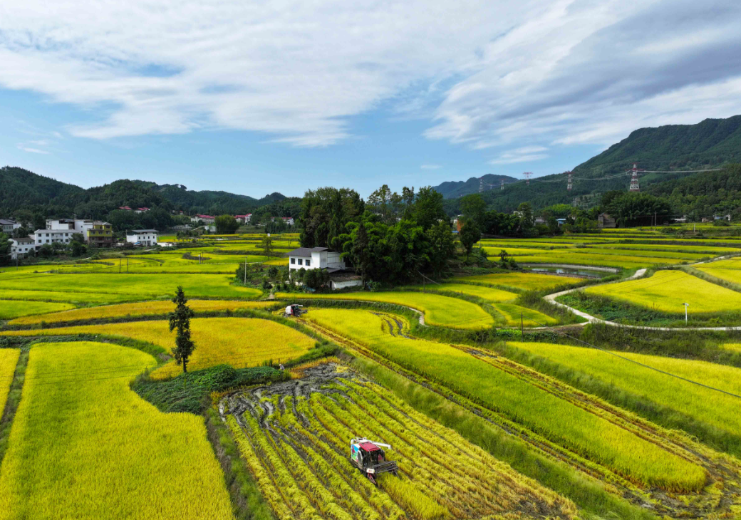 ▲9月21日,梁平区铁门乡铁门社区,收割机在金黄色的稻田中收割水稻(无人机照片)。特约摄影 刘辉 摄/视觉重庆