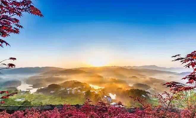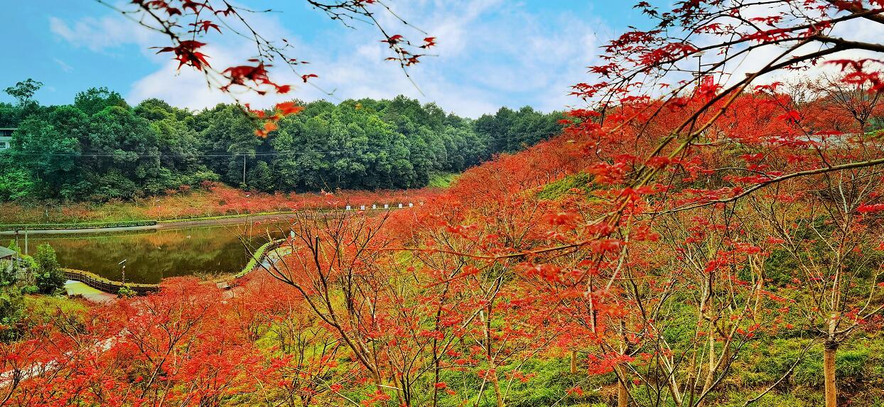 中秋时节,位于巴南区南彭街道的南湖多彩植物园正式开园,1800余亩红枫层林尽染,为南湖湖畔再添一片美景。(摄影 方霞)