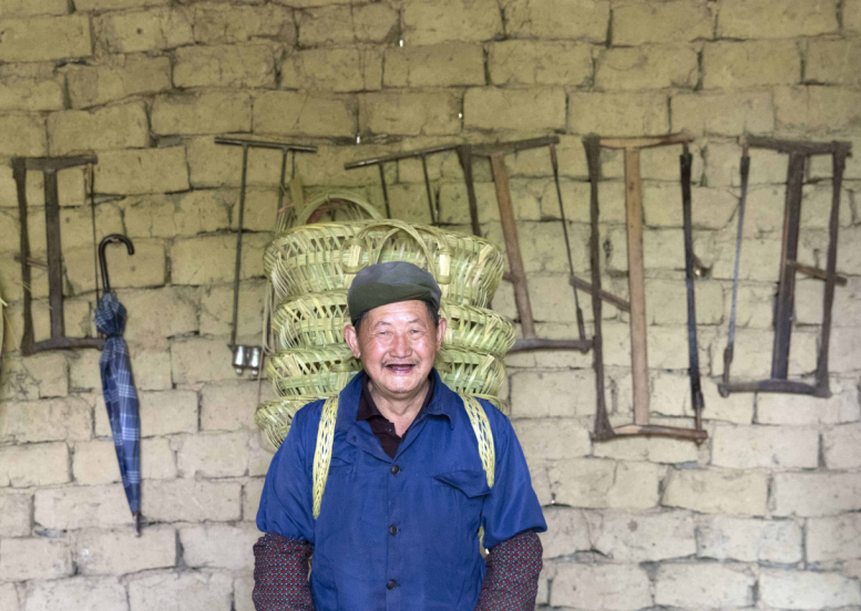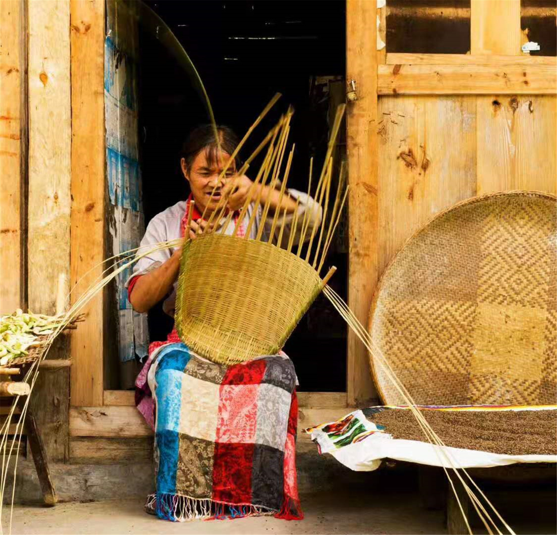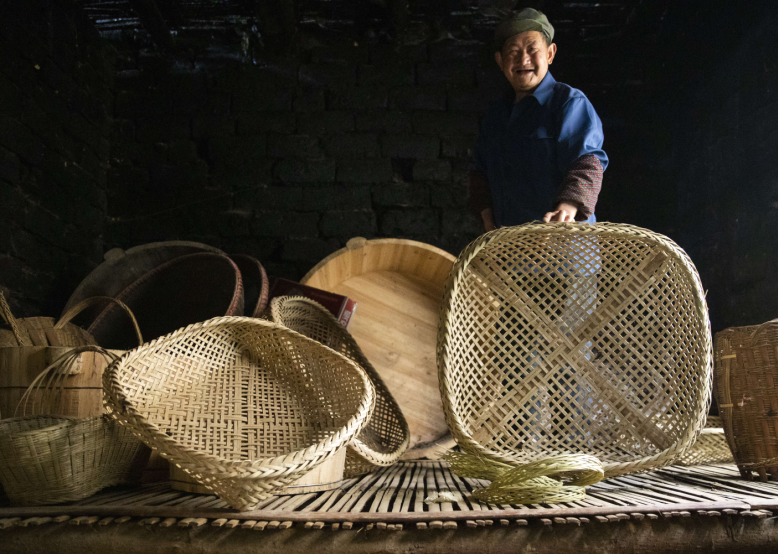 一个个精美簸箕编好成型,那是篾匠手艺人精心编织出的乡愁,是坚定守护的传统记忆。周健 摄